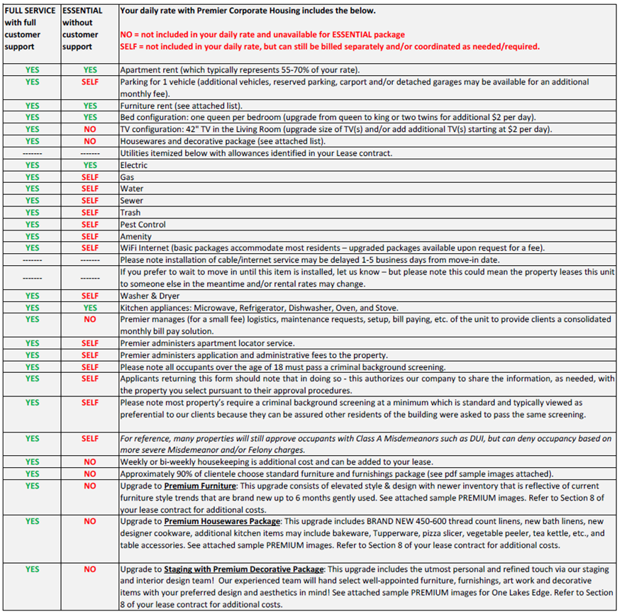 If you're looking for full-service support, including coordinated furnishings, utilities, and housekeeping, our Premier Full Service package may be the better fit for you.